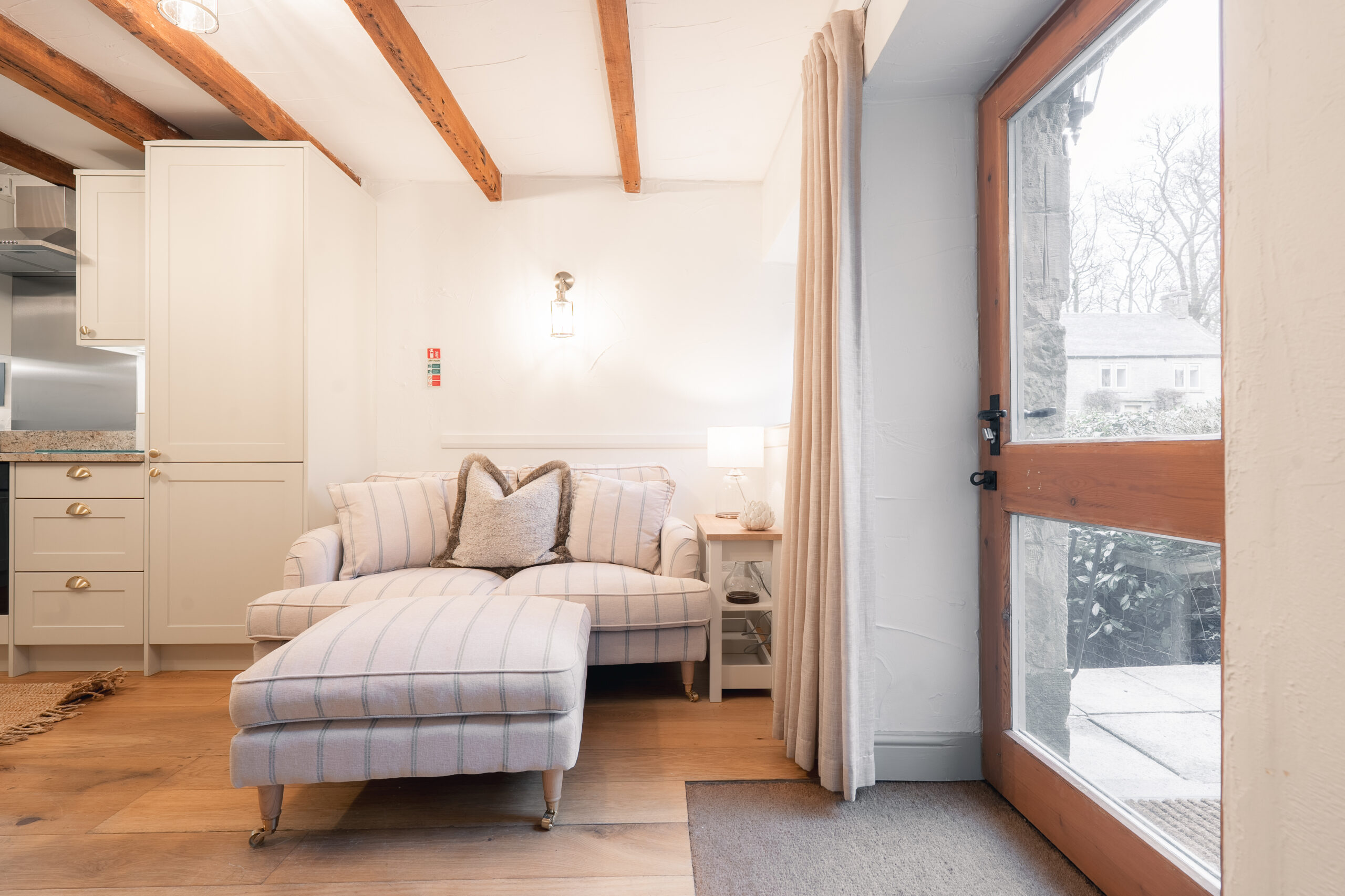 Upstairs you’ll find a beautiful king-size bedroom, along with an elegant vintage-style bathroom featuring a bath with an overhead shower. All our cottages are stocked with our luxury range of toiletries, specially made for Wheeldon Trees by Peak Soap in Bakewell.