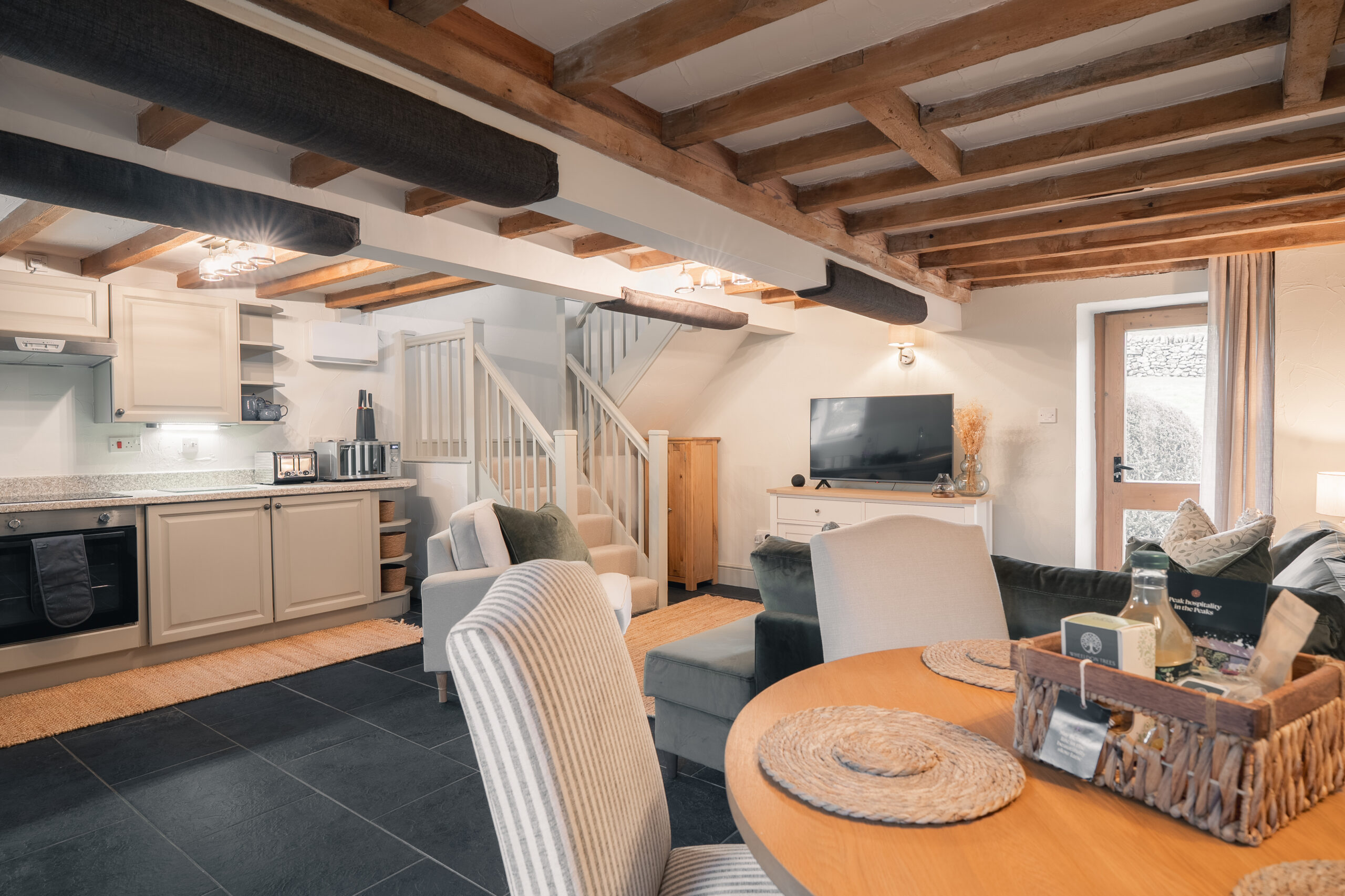 Escape to the beautiful Peak District National Park and enjoy a stay at the historic Elliott Cottage, a charming Derbyshire retreat that sleeps up to four guests. Downstairs, you’ll find a spacious open-plan living area, along with a private enclosed patio — perfect for relaxing with friends and family. Each of our cottages is thoughtfully equipped with everything you might need during your stay, from essentials like olive oil for cooking your favourite meals to our luxury toiletries, especially made for us.